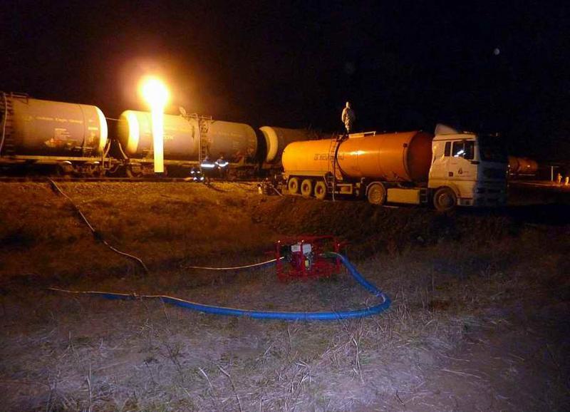 Oil pumping from the emergency rail car into the empty rail car with the help of a mobile facility to pump crude oil based on Eger-2 all-terrain vehicle.