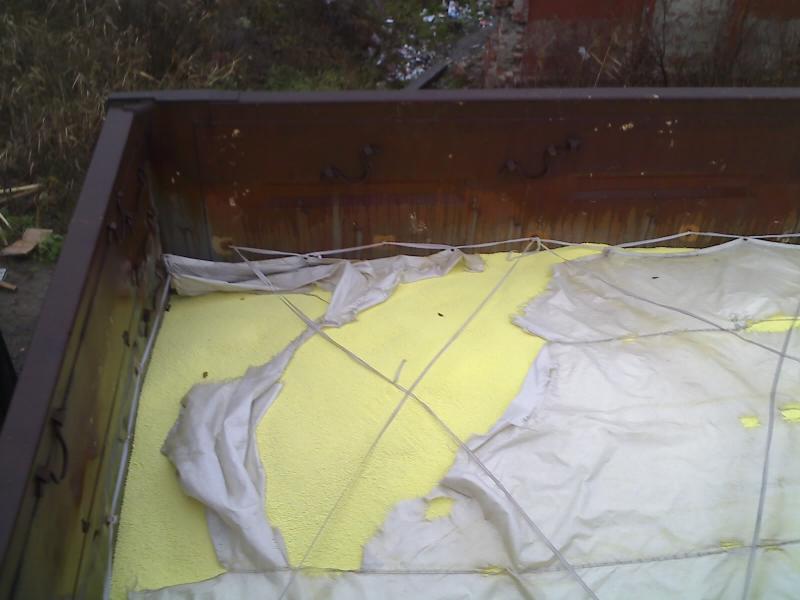 Fig.2.Sulfur fire in an open rail car under the cover – the fire was focused at the rupture of joint connecting cover canvas. The rail car is shown after the flame in the fire area has been extinguished.